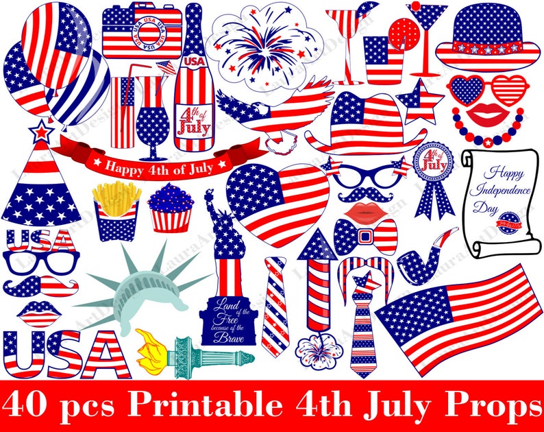 4th Of July Printable Photo Booth Props Set Of 40 Clipart Etsy
